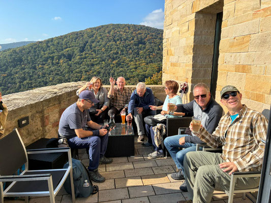 Es ist 7:48 Uhr und wir stehen am Gleis 7 des Vaihinger Hauptbahnhofes. Tatsächlich machen sich 22 bestens gelaunte Wanderer mit dem RE1 auf den Weg in die Pfalz. Von Neustadt geht es auf dem „Pälzer Keschdeweg“ knapp 2 Stunden hinauf zum Hambacher Schloss. Wir werden belohnt mit Sonnenschein und herrlicher Sicht auf die Rheinebene. Nach der Pause führt uns der Weg etwas holprig hinab zum Pfälzer Weinweg bis nach St. Martin. Dort bewirtet uns Karin Moll bestens mit typischen Pfälzer Schmankerln. Im Anschluss genießen wir eine individuelle Weinprobe im Weingut Herrengut. Die Stimmung steigt, das Finale erwartet uns nach weiteren 4 Kilometern in Maikammer. Das Weingut Götz serviert herrliche Flammkuchen in allen Variationen, bevor uns die Deutsche Bahn fast pünktlich nach Haus bringt.
